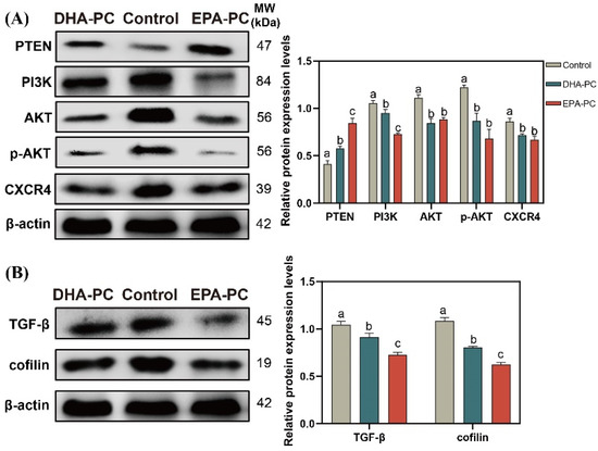 DHA-PC and EPA-PC downregulated the protein level of key transcription factors of the migration. (A) the expression of PTEN, PI3K, AKT, p-AKT, and CXCR4. (B) the expression of TGF-β and cofilin. Different letters (a, b, and c) indicate remarkable differences at p < 0.05 among all groups determined by ANOVA (Bonferroni’s test).