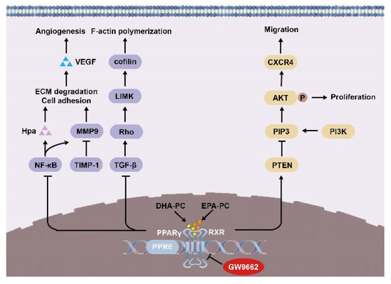 In summary, we demonstrated in 95D cells that DHA-PC and EPA-PC effectively inhibited proliferation, adherence, migration, invasive capability, and disrupted intracellular F-actin. Mechanically, DHA-PC and EPA-PC activated PPARγ, and PPARγ directly regulated the activity of tumor-related factors to achieve the antitumor effects (Figure 9). These findings provide a new perspective on the effects of DHA-PC and EPA-PC on cancer treatment, specifically on their role in the activation of PPARγ. Alternatively, DHA-PC and EPA-PC might be used as practical components applied to exceptional medical food for cancer patients.