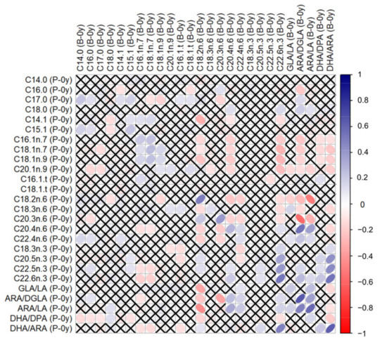 Correlations between GPL-FAs measured in different samples can be found in the Supplementary Table S1. GPL-FAs measured in P-0y and B-0y presented stronger correlations with each other than when compared to measurements at follow-up (P-0y vs. B-1y or B-0y vs. B-1y). In particular, C18:2n-6, C22:6n-3, ARA/DGLA, ARA/LA and DHA/ARA in P-0y presented strong positive correlations (≥0.5) with their respective levels in B-0y, as illustrated in Figure 1.