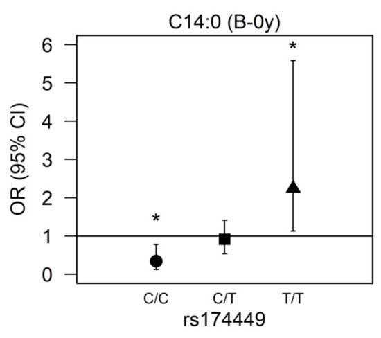 Association between myristic acid (C14:0) and AD modified by rs174449 genotype. B-0y: measured in buccal cells sampled at birth. * Nominal statistically significant (p < 0.05). ●: homozygous major genotype (C/C); ■: heterozygous genotype (C/T); ▲: homozygous minor genotype (T/T).