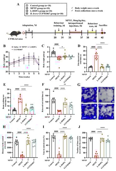 Figure 1A shows the animal experimentation protocol. Before beginning the experiments, the animals were allowed to acclimatize for one week. Forty mice were randomly divided into four groups of ten: control, MPTP, L-DOPA, and B. breve CCFM1067. Mice in the control, MPTP, and L-DOPA groups were administered 200 μL of saline daily from days 8 to 41. During days 33–37, with the exception of the control group, daily MPTP therapy was administered (30 mg/kg MPTP intraperitoneal injection; MedChemExpress, Shanghai, China). On days 33–41, the L-DOPA group received an oral gavage of L-DOPA (100 mg/kg; MedChemExpress) and benserazide (25 mg/kg; MedChemExpress) in saline. The B. breve CCFM1067 group received an oral gavage of B. breve CCFM1067 (109 CFU/200 μL saline) daily on days 8–41, and MPTP treatment on days 33–37. All mice were weighed and feces were collected once a week. In addition, behavioral tests were performed on days 38–41. All mice were sacrificed on day 42 for further analysis.