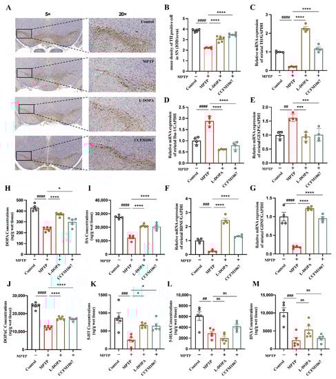 B. breve CCFM1067 alleviated MPTP-induced neuropathologic changes and glial activation, restored the MPTP-induced reduction of the levels of striatal neurotransmitters. (A) Images of immunohistochemically stained cells positive for tyrosine hydroxylase (TH) in the SN (Under 5× and 20× magnification, one typical picture from each group). (B) The mean density of TH positive cells in SN in each group (n = 3/group). The mRNA expressions of TH (C), Iba-1 (D) and GFAP (E); BDNF (F) and GDNF (G) in the striatum (n = 4/group). The concentrations of neurotransmitters in the striatum: L-DOPA (H), DA, dopamine (I), DOPAC, 3,4-dihydroxyphenylacetic acid (J), 5-HT, 5-hydroxytryptamine (K), 5-HIAA, 5-hydroxyindoleacetic acid (L), and HVA, homovanillic acid (M) (n = 5/group). Data are means with SEM; ## p < 0.01, ### p < 0.001, #### p < 0.0001 vs. control group; * p < 0.05, *** p < 0.001, **** p < 0.0001 vs. MPTP group, “ns” means there was no noticeable difference between the groups.
