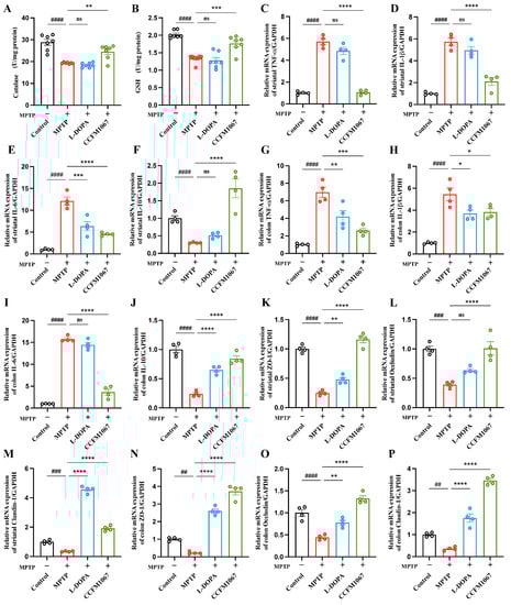 B. breve CCFM1067 reduced MPTP-induced oxidative stress, suppressed the generation of pro-inflammatory molecules in the SN and colon, and alleviated intestinal barrier damage. The antioxidant activities of catalase (A) and GSH (B) in the midbrain (U/mg protein) (n = 7/group). (C–J) The mRNA expression of TNF-α, IL-1β, IL-6 and IL-10 in the mouse midbrain and colon (n = 4/group). (K–P) The mRNA expression of ZO-1, occludin, and claudin-1 in the midbrain and colon of mice (n = 4/group). Data are means with SEM; ## p < 0.01, ### p < 0.001, #### p < 0.0001 vs. control group; * p < 0.05, ** p < 0.01, *** p < 0.001, **** p < 0.0001 vs. MPTP group, “ns” means there was no noticeable difference between the groups.