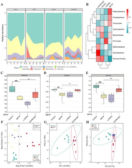 Phylum−level changes and gut microbiota diversity analysis among the control, MPTP, L−DOPA, and B. breve CCFM1067 groups (A) Stacked bar plots representing the relative abundance of phyla in individual samples from the four different groups. (B) Heat map of the relative abundance of nine bacterial phyla. (C–E) α−diversity analysis: Observed, Shannon, and Simpson indexes. (F) PCoA of β−diversity. The Bray–Curtis matrix, analyzed with PERMANOVA, was used to evaluate the differences between groups. The axes are labeled with the contribution vectors (PCoA1 and PCoA2) of the main components, and mouse samples are color-coded to distinguish across groups. (G) Principal component analysis (PCA) of β−diversity between the control and MPTP−treated groups. (H) PCA of β−diversity among the four groups. Data are means with SEM; ## p < 0.01, ### p < 0.001 compared with the Control group; * p < 0.05, ** p < 0.01 vs. MPTP group, “ns” means there was no noticeable difference between the groups.