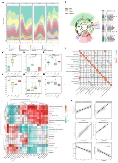 The process for sequencing fecal 16S rRNA is discussed in full in Supplementary Materials S1.4. To analyze the raw sequencing data, we used the platform Quantitative Insights into Microbial Ecology (QIIME). Selected OTUs from the Greengenes 13.5 database was based on a nucleotide identity criteria of 97%. Species richness and distributional evenness among very uncommon OTUs were used to calculate the Observed, Shannon, and Simpson indices, which were used to evaluate the α-Diversity. β-Diversity was calculated using Bray–Curtis distances, displayed using principal component analysis (PCA) and principal coordinate analysis (PCoA), and differences were determined using permutational multivariate analysis of variance (perMANOVA). Microbiological biomarkers were separated using linear discriminant analysis (LDA) effect size (LEfSe) (Wilcoxon rank-sum test, p < 0.05 and log LDA > 4.0 was chosen as the criteria), which was shown as a taxonomic cladogram tree. Predicted functional pathways were annotated using the KEGG orthology, and the metagenomes of gut microbiota were computed from 16S rRNA sequences using the Phylogenetic Investigation of Communities by Reconstruction of Unobserved States (PICRUSt) method. Using the Wekemo Bioincloud (https://www.bioincloud.tech (accessed on 20 June 2022)), the aforementioned studies were conducted. The network of associations was constructed using Spearman’s correlation coefficients and the OmicStudio tools (https://www.omicstudio.cn/tool (accessed on 29 June 2022)). Unless otherwise stated, suggested settings were always utilized.