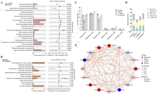 B. breve CCFM1067 treatment affects gut microbial functions in MPTP-induced PD mice, which may be mediated by microbial metabolites. (A) Differences in predicted functions between control and MPTP groups in the Kyoto Encyclopedia of Genes and Genomes (KEGG) pathways at level 3 (Welch’s t test, two-sided, Storey FDR q < 0.01). (B) Differences in predicted functions between B. breve CCFM1067 and MPTP groups in the KEGG pathways at level 3 (Storey FDR q < 0.05). (C) Concentration (µmol/g feces) of SCFAs. (D) Total SCFAs: the amount of acetic, propionic, isobutyric, butyric, isovaleric, and valeric acids add up to the total SCFAs (n = 5/group). (E) A network of correlations between different experimental findings in the microbiota–gut–brain axis. The different node colors show different classifications, the red, pink, purple, and blue nodes correspond to the experimental results regarding the gut microbiota, brain, colon, and motor function of the mice. Negative Spearman correlation coefficients are represented by gray, dashed lines (R < −0.5), whereas positive correlation coefficients are shown with solid orange lines (R > 0.5). Spearman correlation coefficient values below −0.5 (negative correlation) are indicated with gray dotted lines, and coefficient values above 0.5 (positive correlation) are indicated with solid orange lines. The strength of the correlation is indicated by the thickness of the line. Data are means with SEM; unpaired Student’s t-test #### p < 0.0001, compared with the control group; one-way ANOVA with Dunnett’s test for multiple comparisons between MPTP, L-DOPA, and B. breve CCFM1067 groups, * p < 0.05, *** p < 0.001, **** p < 0.0001 vs. MPTP group, “ns” means there was no noticeable difference between the groups.