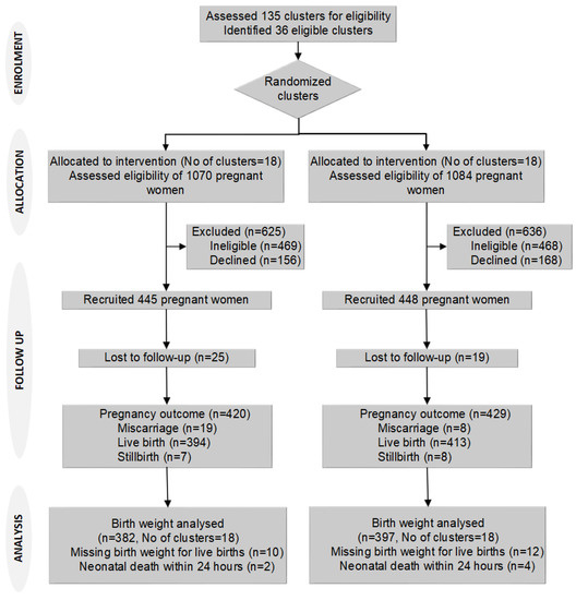 We required 720 pregnant women to achieve 80% power to detect a difference of 100 g in birth weight between groups. We assumed a mean birth weight of 2531 g (standard deviation (SD) 415 g) in the control group based on the findings from a similar trial in Bangladesh [26]. We set a significance level of 0.05 (two-sided) and assumed an intra-cluster correlation coefficient (ICC) of 0.03 [27] and 36 clusters with an average of 10–15 live births per cluster per month. To adjust for 10% pregnancy loss and 15% loss to follow-up based on similar trials [26,28], we inflated the required sample size to 900 pregnant women.
