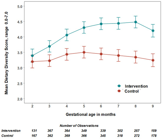 The mean number of food groups consumed increased in the intervention group and was significantly higher from the third month of pregnancy (Figure 2). The largest difference was in the eighth month of pregnancy (Table 4, Figure 2). The mean number of animal-source protein foods consumed was significantly higher from the fourth month of pregnancy. In the fourth gestational month, the intervention participants consumed 1.5 animal-source foods/day (95% CI: 1.38, 1.64) compared to 1.1 (95% CI: 1.02, 1.25) in control participants. The largest difference was in the eighth gestational month when intervention participants consumed 1.9 animal source foods/day (95% CI: 1.68, 2.15) compared to 1.1 (95% CI: 1.02, 1.24) in control participants.