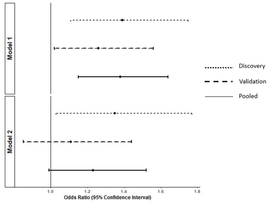 Multivariable-adjusted associations 1 between standardized concentration of propionic acid in serum and the odds of subsequent cognitive decline over 12 years in the discovery (n = 418), validation (n = 420) and pooled samples (n = 838). 1 Estimated using conditional logistic regressions (conditioned using matching variables, i.e., age, sex and educational level). Model 1: adjusted for potential confounders (alcohol consumption and smoking). Model 2: adjusted for confounders (alcohol consumption and smoking) and potential mediators (body mass index, hypertension, hypercholesterolemia, and diabetes).