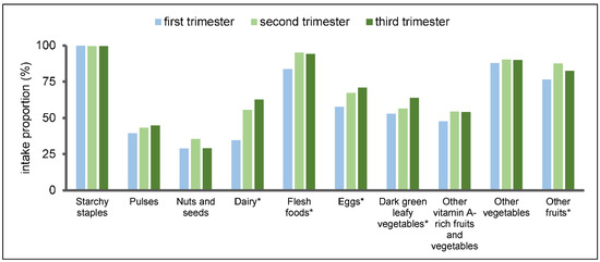 Proportions of food group consumption in the different trimesters. * Significant difference of food group intake proportion in the three trimesters (p < 0.05).