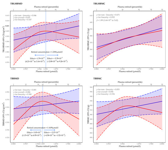 In Figure 1, we used restricted cubic splines to flexibly model and visualize the relationship between the predicted plasma retinol concentration and the bone mineral indexes. The effect of plasma retinol on the TBLH BMD was positively steep, rising (estimated average effect = 1.79 × 10−2 g/cm2, 95% CI: 4.21 × 10−3–3.16 × 10−2 g/cm2) until 1.24 μmol/L, and then, it started to decline (estimated average effect = −5.78 × 10−3 g/cm2, 95% CI: −2.08 × 10−2–9.26 × 10−3 g/cm2) afterwards (p for non-linearity = 0.046, p for overall = 0.037). Consistently, there was also an inverted U-shaped relationship which was observed for the TB BMD (p for non-linearity = 0.001, p for overall = 0.004); the estimated average effects per μmol/L increase in the plasma retinol concentration increase were 3.05 × 10−2 g/cm2 (95% CI: 1.15 × 10−2–4.95 × 10−2 g/cm2) below 1.17 μmol/L and −2.37 × 10−2 g/cm2 (95% CI: −4.58 × 10−2 – −1.52 × 10−3 g/cm2). These similar association did not have statistical significance for the TB BMC (p for non-linearity = 0.053, p for overall = 0.056). However, a significantly positive linear relationship between the plasma retinol concentration and the TBLH BMC was detected; per μmol/L increase in the plasma retinol concentration resulted in a 1.89 g (95% CI: 1.64 × 10−1–3.62 g) increase in the TBLH BMC (p = 0.032).