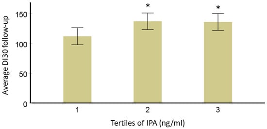 Averaged disposition index during the 7-year follow-up (y-axis) by tertiles (1st n = 31, 2nd n = 32, 3rd n = 31) for serum IPA concentration (x-axis, models adjusted for age, sex, BMI, and study group) in the DPS. * Represents p-value < 0.05 vs. 3rd one for IPA. The bars represent the estimated marginal means with confidence intervals (95%).
