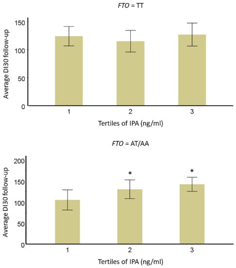 We observed a significant trend for the interaction of IPA with FTO variant rs9939609 (p = 0.05). In individuals with the minor allele A, we found that those in the lowest IPA tertile had lower averaged IPA concentrations as compared with the second (p-value = 0.003) and third (p-value = 0.018) tertiles for DI30. No association was found in individuals with a major T allele (p-value = 0.98) (Figure 4). This interaction of IPA with FTO suggests a novel mechanism that might include an impact linked to food cognition and addiction as suggested by Dong et al. [58].