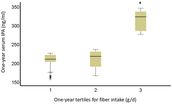 We also investigated whether thirds of serum IPA concentrations would be related to other surrogates of serum insulin and plasma glucose metabolism (fasting and post-challenge 1 h and 2 h glucose and insulin concentrations). As with DI, follow-up 1-h and 2-h post-challenge glucose levels during an oral glucose tolerance test were associated with thirds of IPA in a 1-year study. Participants in the lowest third of serum IPA concentration have lower 1-h and 2-h glucose levels during the 7-year follow-up compared with the second and third (p-value = 0.013, and p-value = 0.03, respectively), but no significant differences between those in the highest third vs. the rest (p-value < 0.10 for all comparisons). We were able to confirm, in all participants, an association between fiber intake and IPA. People in the lowest third of fiber intake (13.5 ± 2.5 g/d) have a significantly lower serum concentration of IPA compared with those in either 2nd (p-value < 0.001) or 3rd (p-value = 4 × 10−6) third of fiber intake (19.7 ± 1.5 g/d; 28.7 ± 5.3 g/d, respectively). There was no significant difference in IPA serum concentration between the 2nd and 3rd third of fiber intake (p-value = 0.49) (Figure 5).
