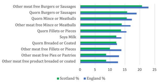 When looking at purchasing trends, we have presented the 10 most popular products (Figure 1), with the three most frequently purchased PBAFs being “other meat free burgers and sausages” “mycoprotein burgers and sausages” followed by mycoprotein mince and meatballs. They all depict meat free substitutes for ultra-processed meat products. Four products were mycoprotein products. It can be seen, that more PBAF were purchased in England than in Scotland, which was statistically significant (p = 0.041).