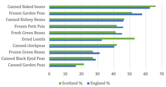 The three most frequently purchased wholefood plant proteins were canned baked beans (a traditional food item in the UK), frozen garden peas and canned kidney beans (Figure 2). Amongst the rest of the ten most frequently purchased wholefood proteins were kitchen staples such as frozen petit pois, fresh and frozen green beans, dried lentils, canned chickpeas, black eyed peas and garden peas. Green beans were the only fresh item, whereas half of food items were canned, falling under the processed food category [24]. Scottish people bought significantly more dried lentils (p < 0.001) than participants from England.
