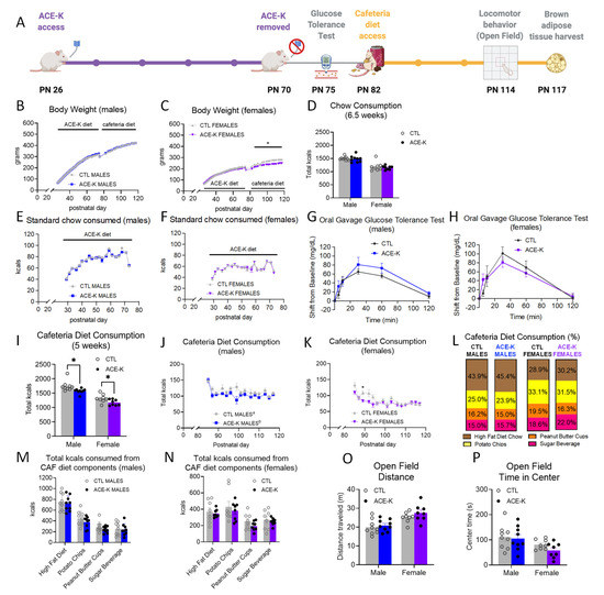 Effects of early life consumption of ACE-K on energy balance parameters during adulthood. Early life ACE-K consumption at the ADI (15 mg/kg; (A)) had no effect on body weight (B,C), standard chow intake (D–F), or glucose tolerance (G,H), relative to controls that did not have access to ACE-K. When challenged with a cafeteria diet in adulthood, both ACE-K males and females reduced their total caloric intake relative to controls (I–K), with no differences in kcals consumed from the cafeteria diet components (L–N). Although a reduced caloric intake decreased body weight in females (C), there were no differences in body weight in males (B). These results were not confounded by differences in locomotor activity (O) or anxiety-like behavior (P). Data are represented as mean ± SEM, * p < 0.05; different letters (a,b) indicate a significant main effect between diet groups in (J), p < 0.05. PN: postnatal day; CAF: cafeteria; CTL: control; ACE-K: acesulfame potassium; kcal: kilocalories.