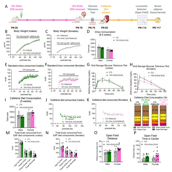 Early life access to a bottle of sucrose with a caloric content equivalent to 10% of the total number of calories consumed from chow the day before (from PN 26-70; timeline shown in Figure 2A) did not influence body weight relative to controls (Figure 2B,C). There were also no group differences in intake of chow (Figure 2D–F). Water intake decreased in male rats (significant main effect of group and the group × time interaction, with significant post hoc comparisons at PN 29 and 36, p < 0.05; Supplementary Figure S2) and female rats (significant group × time interaction, p < 0.05 no significant post hoc comparisons; Supplementary Figure S2). These differences in water intake were likely due to compensation for the volume of the sucrose beverage consumed per day (10–20 mL). At PN 75, after daily sucrose access ceased, there were no group differences in glucose tolerance (Figure 2G,H). The early life sucrose consumption also did not affect total caloric consumption of a cafeteria diet during adulthood, nor was the consumption of any of the individual dietary components impacted by group in either males or females (Figure 2I–N and Supplementary Figures S2 and S4). Likewise, locomotor activity (Figure 2O) and anxiety-like behavior (Figure 2P) were unaffected in the 10% KCAL SUG group.