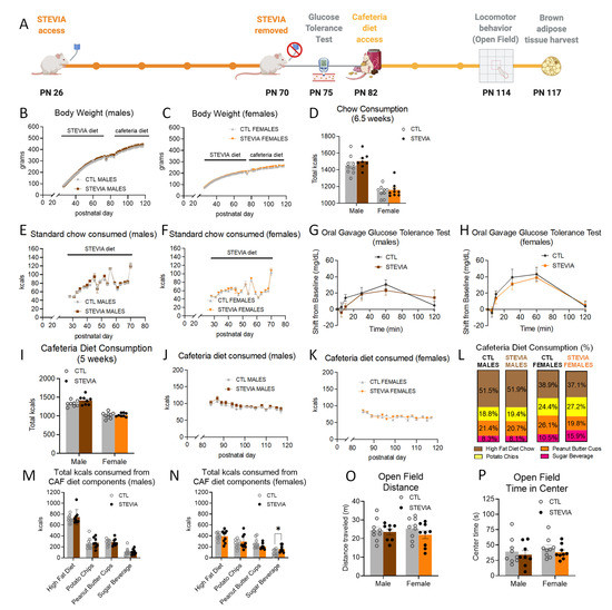 Effects of early life consumption of stevia in rats on energy balance parameters during adulthood. Early life stevia consumption at the ADI (4 mg/kg; (A)) had no effect on body weight (B,C), chow intake (D–F), glucose tolerance (G,H), or total calories consumed during adult exposure to the cafeteria diet (I–K) relative to controls that did not have sugar access during adolescence. There were no significant differences in the percentage of calories consumed from the four cafeteria diet components in either male or female rats (L). Early life stevia consumption did not alter the total calories consumed from the cafeteria diet components in male rats during adulthood (M), but it did significantly increase the number of calories consumed from the sugar beverage in female rats during cafeteria diet consumption in adulthood – in the absence of differences among the other three cafeteria diet components (N). Locomotor activity (O) and anxiety-like behavior (P) were not influenced by stevia exposure in early life. Data are represented as mean ± SEM, * p < 0.05; PN: postnatal day; CAF: cafeteria; CTL: control; kcal: kilocalories.
