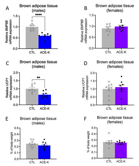 Following an injection of an anesthetic (ketamine 90 mg/kg, xylazine 2.7 mg/kg, and acepromazine 0.64 mg/kg), interscapular brown adipose tissue (BAT) was dissected and flash frozen in a beaker filled with isopentane and surrounded by dry ice. To quantify the relative UCP1 and BMP8B mRNA expression between the control (n = 18, 9 females and 9 males) and ACE-K (n = 18, 9 females and 9 males) rats in the BAT, a reverse transcriptase quantitative polymerase chain reaction (RT-qPCR) was performed as previously described [38]. Briefly, the total RNA was extracted from each sample using the RNeasy Lipid Tissue Mini Kit (Cat No. 74804, Qiagen, Hilden, Germany) according to the manufacturer’s instructions. The total RNA concentration per sample was measured using a NanoDrop Spectrophotometer (ND-ONE-W, ThermoFisher Scientific, Waltham, MA, USA). RNA (2000 ng) was reverse transcribed to cDNA using the QuantiTect Reverse Transcription Kit (Cat No. 205311, Qiagen) according to the manufacturer’s instructions. The following Applied Biosystems probes for use with rats were utilized: Rplp0 (Rn03302271_gH), Ucp1 (Rn00562126_m1), and Bmp8b (Rn01516089_gH). qPCR was performed with the Applied Biosystems TaqMan Fast Advanced Master Mix (Cat#4444557, ThermoFisher Scientific) using the Applied Biosystems QuantStudio 5 Real-Time PCR System (ThermoFisher Scientific). All reactions were conducted in triplicate, and control wells without a cDNA template were included in order to verify the absence of genomic DNA contamination. The triplicate Ct values for each sample were averaged and normalized to a Rplp0 expression. The comparative 2−ΔΔCt method was utilized in order to quantify relative expression levels between groups for the genes of interest.