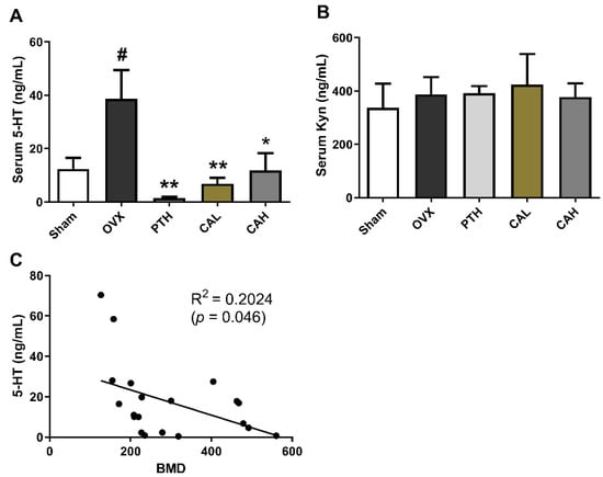 The effects of SWCA extract on serum levels of serotonin (5-HT) and kynurenine (Kyn) in ovariectomized rats treated with PTH and SWCA extract, and the correlation between 5-HT and BMD. (A) Serum 5-HT level; (B) serum Kyn level; (C) the correlation between 5-HT and bone mineral density (BMD). The rats were orally administrated with vehicle (Sham, OVX), 140 mg/kg SWCA extract (CAL), 280 mg/kg SWCA extract (CAH) or intramuscular injected with 1.8 μg/kg Teriparatide (PTH) for 10 weeks. Data are presented as the mean ± SEM, n = 6–8. # p < 0.05 vs. Sham, * p < 0.05, ** p < 0.01 vs. OVX by one-way ANOVA followed by Tukey’s post-hoc test. Pearson R2 was calculated by linear regression analysis. p < 0.05 was considered to be statistically significant.