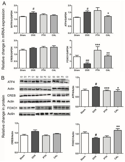 Gut-derived serotonin is crucial for bone remodeling. It can bind to the membrane 5HTR1b receptor of osteoblasts and then trigger the 5HTR1b/CREB/cyclins signaling cascade to influence osteoblast proliferation []. In the current study, the cascade signals related to gut-derived serotonin in bone, including 5HTR1b, ATF4, CREB, and FOXO1, were determined in the femur. As a low dose of SWCA exerted more significant effects on bone than the high dose of SWCA, CAL was selected for further signaling pathway study. Ovariectomy significantly increased the gene expression of 5HTR1b in rat bone, but the expression of 5HTR1b was not altered by drug treatment in OVX rats (Figure 3A). The gene and protein expressions of ATF4 and FOXO1 were significantly upregulated and downregulated in OVX rats, respectively, while CAL treatment significantly restored them to normal levels (Figure 3A,B). In contrast to the effects of CAL treatment, PTH treatment did not alter the gene expression of ATF4 or protein expression of FOXO1, but decreased the protein expression of ATF4 and increased the gene expression of FOXO1. OVX operation and treatment did not influence the gene and protein expressions of CREB.