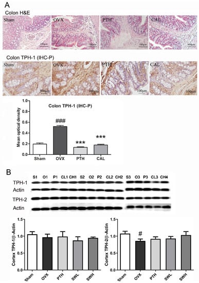 The effects of SWCA extract on colon and brain cortex TPH expressions. (A) The H&E staining and immunohistological staining of TPH-1 in colon sections at 100× magnifications; (B) the protein expressions of TPH-1 and TPH-2 in brain cortex. The rats were orally administrated with vehicle (Sham, OVX), 140 mg/kg SWCA extract (CAL), 280 mg/kg SWCA extract (CAH) or intramuscularly injected with 1.8 μg/kg Teriparatide (PTH) for 10 weeks. Data are presented as the mean ± SEM, n = 6–8. # p < 0.05, ### p < 0.001 vs. Sham, *** p < 0.001 vs. OVX by one-way ANOVA followed by Tukey’s post-hoc test.