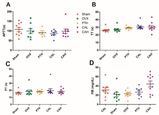 The effects of SWCA extract on coagulation. (A) APTT, activated partial thromboplastin time; (B) TT, thromboplastin time, (C) PT, prothrombin time; (D) FIB, fibrinogen. The rats were orally administrated with vehicle (Sham, OVX), 140 mg/kg SWCA extract (CAL), 280 mg/kg SWCA extract (CAH) or intramuscularly injected with 1.8 μg/kg Teriparatide (PTH) for 10 weeks. Data are presented as the mean ± SEM, n = 6–10. Group comparisons were performed with one-way ANOVA followed by Tukey’s post-hoc test. APTT, partial thromboplastin time; TT, thromboplastin time; PT, prothrombin time; FIB, fibrinogen.