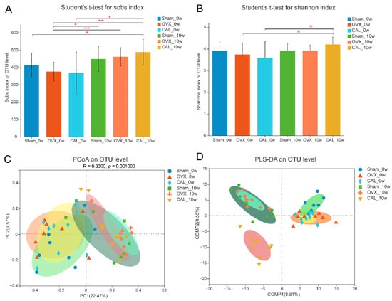 Sobs and Shannon index, and PCoA and PLS-DA score plots based on operational taxonomic unit (OTU) abundance. (A) Sobs index; (B) Shannon index; (C) Principal coordinate analysis (PCoA); (D) Partial least squares-discriminant analysis (PLS-DA). The rats were orally administrated with vehicle (Sham, OVX) or 140 mg/kg SWCA extract (CAL) for 10 weeks. Statistical analysis was performed by Student’s t-test (n = 8–9) in (A,B), and the significant difference between two groups is presented as * p < 0.05 and ** p < 0.01.