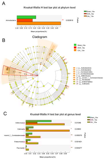 CAL treatment for 10 weeks extremely enriched the abundance of Antinobacteria phylum in rat fecal samples (Figure 7A). In order to identify the clade of Antinobacteria phylum, the microbial community from phylum to genus level was analyzed by the LEfSe tool with an LDA score > 2. As shown in Figure 7B, the LEfSe analysis showed that a series of microbial taxa had contributed to the enrichment of Antinobacteria phylum, including class: Antinobacteria → order: Coriobacteriales → family: Coriobacteriaceae → genus: Adlercreutzia, norank_f_Coriobacteriaceae, Parvibacter, Enterorhabdus and Collinsella (Figure 7B). The five genera that contributed to the enrichment of Antinobacteria phylum abundance are shown in Figure 7C. All these genera were significantly reduced in the OVX groups when compared with the Sham groups, and were highly induced in OVX rats treated with CAL (Figure 7C).