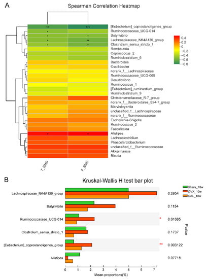 The correlation between relative abundance of top 30 genera and BMD of both tibia and femur, and the bar chart of the genera significantly related to BMD. (A) Spearman correlation heatmap. Red, positive correlation; Green, negative correlation. (B) Bar chart of genera related to BMD. The rats were orally administrated with vehicle (Sham, OVX) or 140 mg/kg SWCA extract (CAL) for 10 weeks. Statistical analysis was performed by the Kruskal-Wallis H test (n = 8–9) followed by the Tukey-Kramer test, and significant difference is presented as * p < 0.05, ** p < 0.01 and *** p < 0.001.
