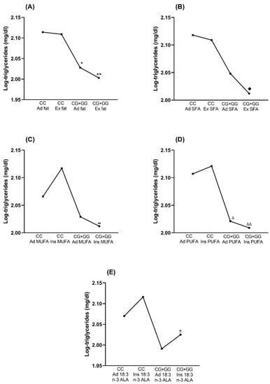 Maldonado-González, M.; Hernández-Nazara, Z.H.; Torres-Castillo, N.; Martínez-López, E.; de la Cruz-Color, L.; Ruíz-Madrigal, B. Association between the rs3812316 Single Nucleotide Variant of the MLXIPL Gene and Alpha-Linolenic Acid Intake with Triglycerides in Mexican Mestizo Women. Nutrients 2022, 14, 4726. https://doi.org/10.3390/nu14224726
