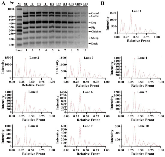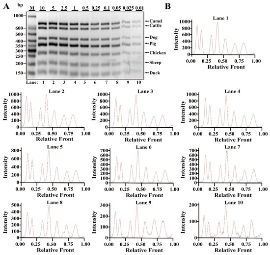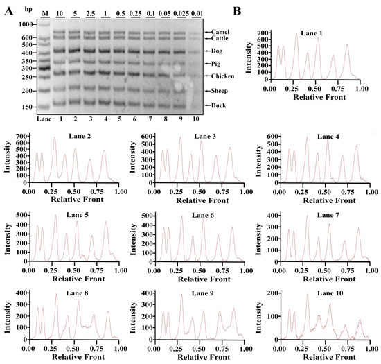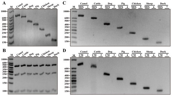 Using the simplex PCR system, the specificity of the target primer was firstly checked against land animals including sheep, dog, horse, chicken, duck, turkey, pigeon, camel, rabbit, ostrich, cattle, cat, goose and pig, as well as aquatic species including small yellow croaker, tuna and black carp. PCR fragments were run on 5% agarose gel and visualized for proper amplification. To examine the sensitivity of the multiplex PCR assay, ten concentrations ranging from 10 to 0.01 ng were selected as the template contents s of multiplex PCR assays. Sensitivity tests were performed using the aforementioned multiplex PCR system. To determine the sensitivity of the model mixtures, the raw meat tissue of camel, dog, pig, chicken, sheep and duck were weighed at 0.1%, 0.25%, 0.5%, 1%, 2.5%, 5%, 10% and 15%, respectively, of the total weight. Next, meat samples weighed at the same proportion were simultaneously added to cattle and homogenized. The limits of detection and dynamic range were determined according to the agarose gel analysis and electropherograms. To determine the reproducibility of species-specific primers, meat tissues were subjected to a heat processing treatment of boiled (97–99 °C, 30 min) and microwave-cooked (750 W, 10 min) patterns, respectively. Primers’ reproducibility was confirmed through PCR amplification using genomic DNA of heat processing samples [].