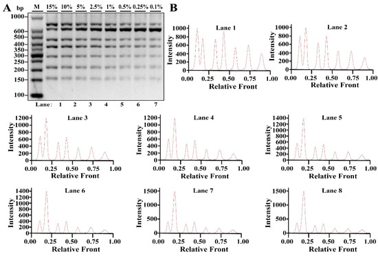 To determine the practicability of the technique in thermally processed meat, raw meat tissues were, respectively, subjected to boiled and microwave-cooked treatments. For boiling meat samples, genomic DNA was isolated from meat tissue exposed to a heat processing treatment of boiled patterns (97–99 °C, 30 min). Multiplex PCR assays showed that seven bands for seven meat species were clearly observed at the range of 0.025–10 ng DNA and intact peak patterns for seven species were obtained in lanes 1–9 (Figure 4A,B), suggesting that the LOD of the heptaplex PCR method was 0.025 ng DNA for seven boiling meat tissues. Meanwhile, microwave-cooked meat tissues were used for DNA isolation, and then, multiplex PCR assays were conducted. Differing from boiling meat tissues, microwave-cooked meat tissues showed that the LOD was approximately 0.01 ng DNA for all meat species (Figure 5A,B). Overall, it is postulated that the threshold value was about 0.01–0.025 ng DNA for the discrimination of heat-processed meat. The data further demonstrate the availability of this method for the inspection of animal species in real-world meat products.