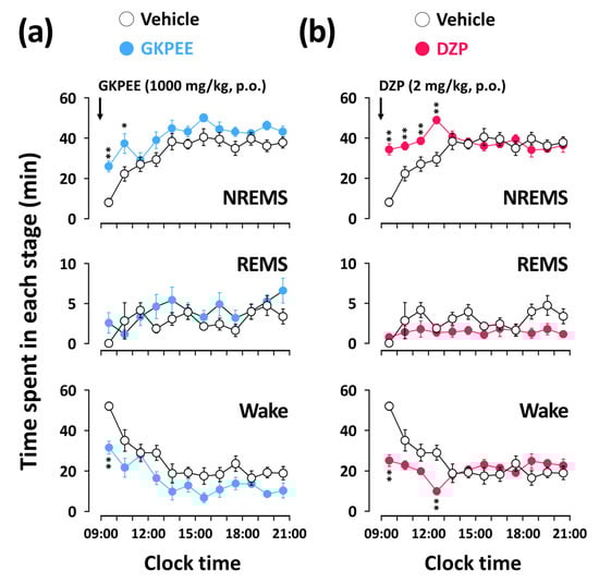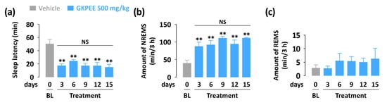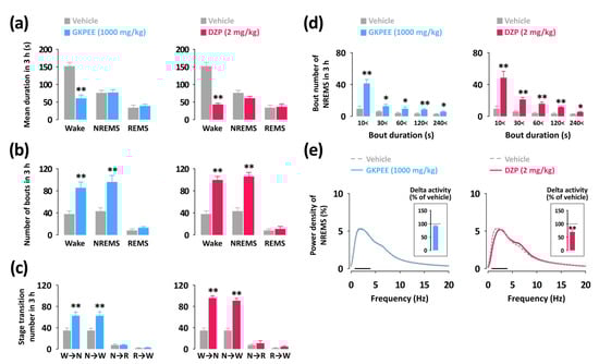 3.2. Effects of Acute Administration of GKPEE on Time-Course Changes in Each Sleep Stage