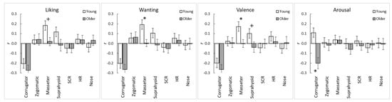 Similar to the young adult group, the subjective ratings of liking, wanting, and valence in the older adult group were significantly negatively correlated with corrugator EMG activity (t > 4.60, p < 0.001, d > 0.89). In this group, the arousal ratings were also significantly negatively correlated with corrugator supercilii EMG activity (t = 3.45, p = 0.002, d = 0.66). No other significant associations between subjective ratings and physiological activity were detected in either group (p > 0.05).