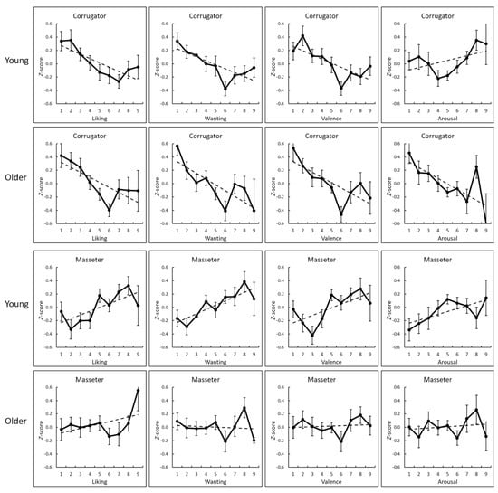 Group mean (with SE) values and regression lines of the subjective ratings (liking, wanting, and valence) and electromyography activity of the corrugator supercilii and masseter muscles in the young and older adult groups (standardized for each individual).