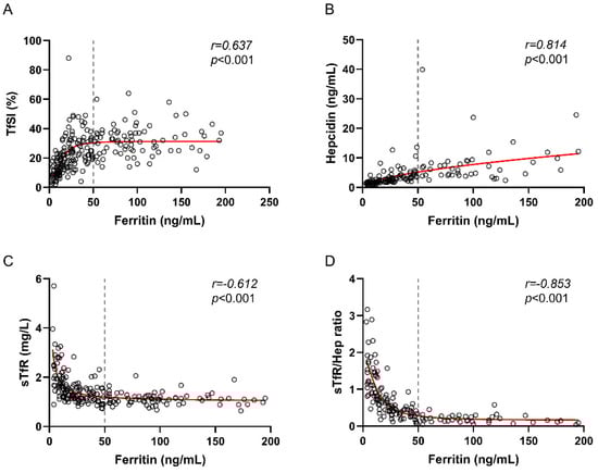 General characteristics and soluble iron-related biomarkers of the 228 included participants are shown in Table 1. It should be noted that 86% were women and had a median age of 44 years (IQR: 35–51) and a median BMI of 24.3 (IQR: 21.5–28). Iron-related biomarkers included hemoglobin (HB), mean corpuscular hemoglobin (MCH), mean corpuscular hemoglobin concentration (MCHC), mean corpuscular volume (MCV), transferrin, TfSI, sideremia, ferritin, sTfR, hepcidin (Hep) and sTfR to hepcidin ratio (sTfR/Hep ratio). A total of 24 patients (10.5%) had anemia (defined as hemoglobin levels below 13 gr/L in men and below 12 gr/L in women) and they showed a median of serum ferritin of 8 [IQR: 5–14.25]. As shown in Figure 1, serum ferritin strongly and directly correlated with TfSI and Hep, and inversely with sTfR and sTfR/Hep ratio (p < 0.001 for all comparisons) (Figure 1A–D).