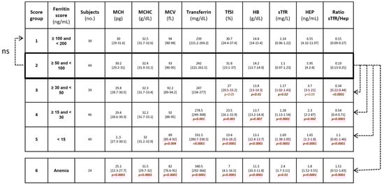 Comparisons of iron biomarkers between different ferritin score groups and anemic subjects. All score groups were compared with group 2, which was considered as the reference group. Abbreviations: HCH, mean corpuscular hemoglobin; MCHC, mean corpuscular hemoglobin concentration; MCV, mean corpuscular volume; TfSI, transferrin saturation index; HB, hemoglobin; sTfR, soluble transferrin receptor; HEP, hepcidin. Continuous variables are expressed as the medians and interquartile ranges (IQR). Categorical variables are expressed as numbers and percentages. Differences between variables and groups were determined by using the Mann–Whitney U-test. ns: not statistically significant.