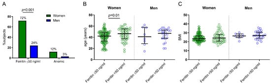 Iron deficiency and anemia frequency and differences in age and BMI depending on ferritin cut-off. Frequency of subjects with serum ferritin levels ≤ 50 ng/mL and with anemia in women and men (A); and differences in age (B) and BMI (C) depending on serum ferritin cut-off of 50 ng/mL in women and men. BMI: body mass index. Differences between categorical and continuous values were determined using the chi-square test and Mann–Whitney U-test, respectively. Only statistically significant differences with p-value < 0.05 are shown.