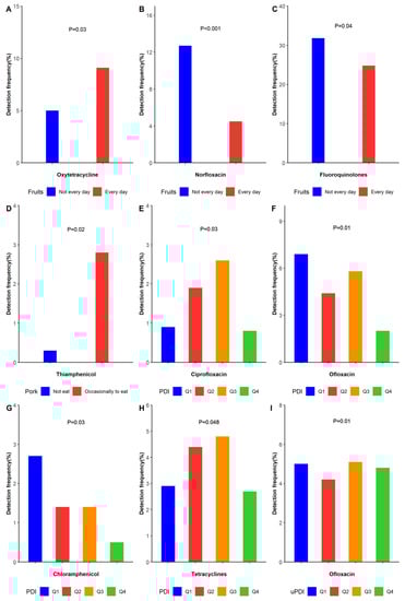 The rate of detection of antibiotics in urine was related to selected dietary characteristics. (The results in Figure 1 are based on the positive results in Table S1). (A) Eating fruits every day and not every day in the detection frequency of oxytetracycline. (B) Eating fruits every day and not every day in the detection frequency of norfloxacin. (C) Eating fruits every day and not every day in the detection frequency of fluoroquinolones. (D) Eating pork occasionally and not eating pork in the detection frequency of thiamphenicol. (E) Detection frequency of four groups of PDI in ciprofloxacin. (F) Detection frequency of four groups of PDI in ofloxacin (G) Detection frequency of four groups of PDI in chloramphenicol. (H). Detection frequency of four groups of PDI in tetracyclines. (I) Detection frequency of four groups of uPDI in ofloxacin.