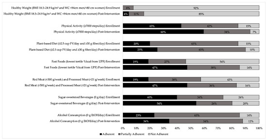 The total score at enrollment was 3.22 ± 1.06 and was increased by 33% to 4.28 ± 1.04 at post-intervention (p < 0.001), with participants significantly improving adherence to all recommendations. At enrollment, the lowest mean component score was displayed for a healthy weight, as no participant began the study adherent to this recommendation. Greatest adherence was observed for the plant-based diet component, though only 20% of participants were meeting this recommendation at enrollment. Healthy weight remained the recommendation with the poorest adherence at post-intervention, while mean physical activity adherence was highest, with 93% of individuals fully or partially meeting the recommendation after the intervention. The proportion of individuals adherent, partially adherent, or not adherent to each recommendation at each time point is visualized in Figure 1.