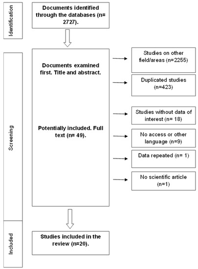 A total of 2727 documents were initially found (366 in MEDLINE, 1665 in Scopus, and 696 in WOS). Figure 1 illustrates the article selection process. After the evaluation of the titles and abstracts, 49 documents were retained for full-text assessment. After the full text was screened, 20 documents were finally included. The characteristics of the studies included are shown in Table 3. The quality of the 20 documents reviewed is shown in Table 4.