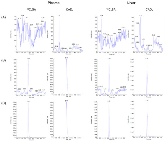UHPLC-MS/MS chromatograms of 13C4SA and CAD4 in plasma and liver samples: (A) blank matrix, (B) LLOQ concentration of spiked blank matrices with IS, and (C) samples (plasma and liver 15 min after PO administration of 100 mg/kg 13C4SA).
