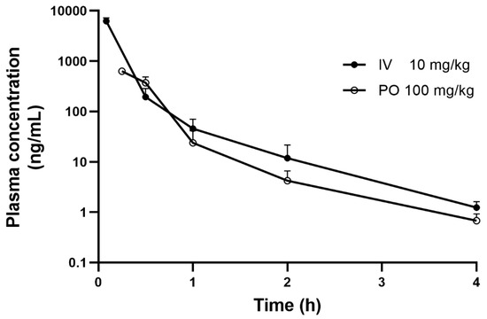 Mean plasma concentration–time curves of 13C4SA in mice after a single IV and PO dose (mean ± SD, n = 3).