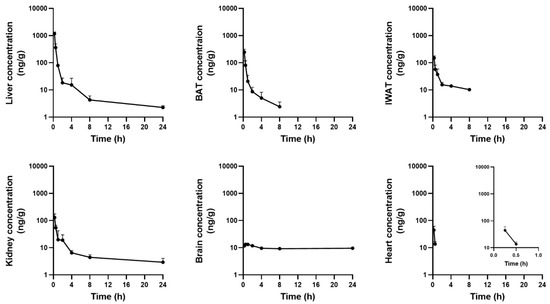 Following PO administration (100 mg/kg) in mice, the tissues were collected and homogenized. Then, the concentration of 13C4SA was examined in heart, liver, kidney, brain, IWAT, and BAT samples at seven different time points. 13C4SA was rapidly distributed in all tissues in mice with Tmax of 0.25–0.5 h. Cmax of 13C4SA was the highest in the liver (1167.6 ng/g), followed by BAT (244.8 ng/g), IWAT (149.0 ng/g), the kidneys (128.8 ng/g), and the heart (44.5 ng/mL). Drug exposure was lowest in the brain (Cmax < 15 ng/mL). Interestingly, the low exposure was maintained until 24 h after administration, whereas it was eliminated in a multi-exponential manner within 24 h in all other tissues. This suggests that hydrophilic and charged succinic acid does not easily penetrate the blood–brain barrier and it is not metabolized or eliminated across the blood–brain barrier very well. Its accumulation in the brain might be attributable to the limited expression of transporters or exchangers to facilitate its transport. Further research to investigate the factors responsible for the accumulation of succinic acid in the brain might be valuable.