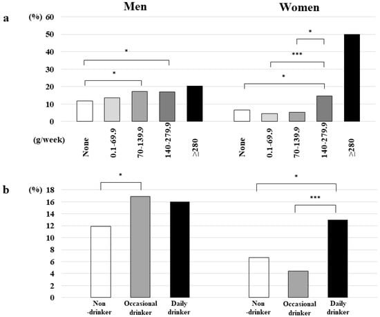 (a) Prevalence of new EE onset according to drinking quantity categories and sex. * p < 0.05, *** p < 0.005. EE, erosive esophagitis. (b) Prevalence of new EE onset according to drinking frequency categories and sex. * p < 0.05, *** p < 0.005. EE, erosive esophagitis.