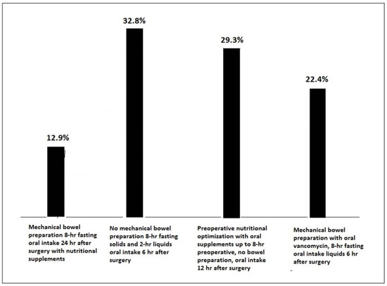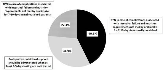 In patients undergoing major abdominal surgery, 55.2% of participants considered that preoperative nutritional support is indicated in all patients with malnutrition for a period of 7–14 days, and 37.9% that preoperative nutritional support for 7 days improves the patient’s nutritional status. In addition, 62.1% considered that TPN should be maintained for at least 5–7 days to obtain any postoperative clinical benefit. Almost all participants (95.7%) considered that oral diet should be started in the first 24 h after major abdominal surgical procedures. Immunonutrition was recommended to reduce postoperative complications and length of hospital stay by 69.8% of participants and in malnourished patients with cancer by 67.2%. The indications of postoperative nutritional support are shown in Figure 1. A total of 40.5% of participants indicated TPN in the case of complications associated with intestinal failure when nutritional requirements are not fulfilled by oral intake in 7–10 days in normally nourished patients.