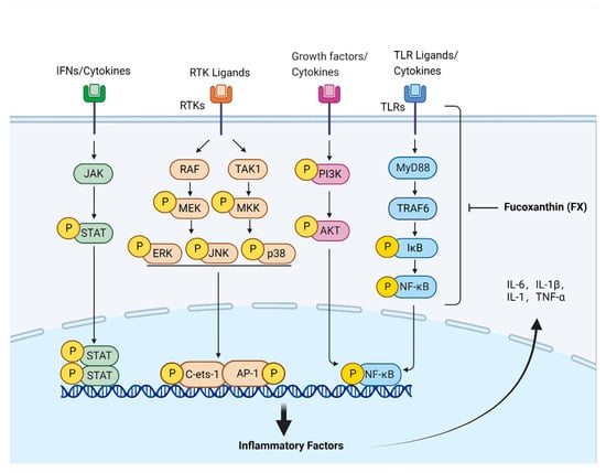 Figure 2. Pathway underlying fucoxanthin-associated anti-inflammatory effects. The development and progression of inflammation is accompanied by the activation of JAK/STAT, MAPK, PI3K/AKT, TLR4/MyD88/NF-κB and other related signaling pathways. FX can inhibit the signal transduction of these inflammatory pathways and down-regulate the expression of inflammatory factors such as IL-6, IL-1β, IL-1, and TNF-α, thereby achieving the anti-inflammatory effect.