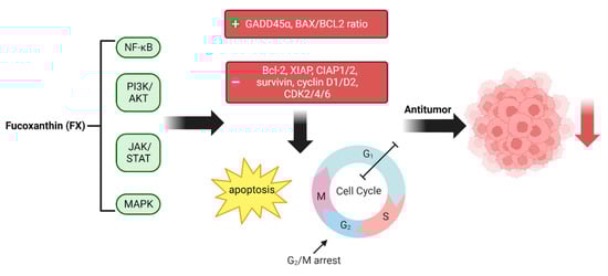 As shown in Figure 4, in vitro experimental results suggest that FX can inhibit inflammatory imbalance and reduce tumor-induced lymph angiogenesis in human breast cancer MDA-MB-231 cells [22] by decreasing the expression levels of p-PI3K, p-Akt, NF-κB, VEGF-C, and VEGF receptor-3 in human lymphatic endothelial cells, thereby inhibiting breast cancer cells through the regulation of inflammation. Ishikawa [19] reported that co-treatment with FX (10 μM) and its metabolite, Fucoxanthinol (FxOH) (5 μM), has a therapeutic effect against adult T-cell leukemia (ATL), a fatal T-lymphocyte malignancy caused by human T-cell leukemia virus type 1 (HTLV-1) infection. Mechanistically, FX and FxOH effects were mediated by the inactivation of AP-1 transcription factor (AP-1) or NF-ĸB, which induces GADD45α expression, cell cycle G1 phase arrest, and the reduction of cyclin D1/D2, CDK4/6, Bcl-2, XIAP, CIAP1/2, and surviving expression, thereby inducing apoptosis. In addition, FX treatment in HepG2 cancer cells can exacerbate toxicity and death through multiple pathways (apoptotic, antioxidant, and anti-inflammatory pathways) [77]. To regulate inflammation, FX can also control the development of malignancy by arresting the cell cycle and causing apoptosis. Treatment with FX (50 and 75 μM) has been shown to induce G2/M arrest and apoptosis in human gastric adenocarcinoma MGC-803 cells and significantly decrease the expression of CyclinB1, survivin, and STAT3 [78].